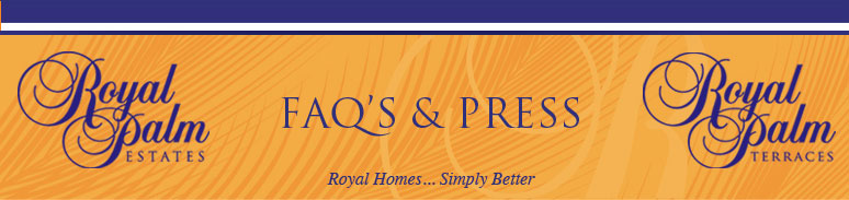 Q6. What is the time it takes to complete the construction of each house or apartment ?Royal Palm Estates provides many standard features that we see as a necessity. We also believe in providing a fully completed home that is ready for occupancy the day the buyer finalizes their purchase. Many of our standard features are optional features for other developers. We offer energy saving standard features like ventilated attic spaces and the provision of R-13 roof insulation. Standard Low-E double pane windows to reduce heat transmission into the occupied space makes our homes more energy efficient than our competitors. Pre-wiring for telephone and TV outlets and a state of the art electronic security system in each house or condo are also items not offered by many competitors without additional cost. Each house will be connected to the main gatehouse with an intercom system so that visitors can be screened and announced to our residents, before they are granted entrance into the community. Neighborhood Security, Landscaping, Trash/ Garbage removal, General grounds-keeping and maintenance services will be performed under the direction of the Home Owners Association (HOA).